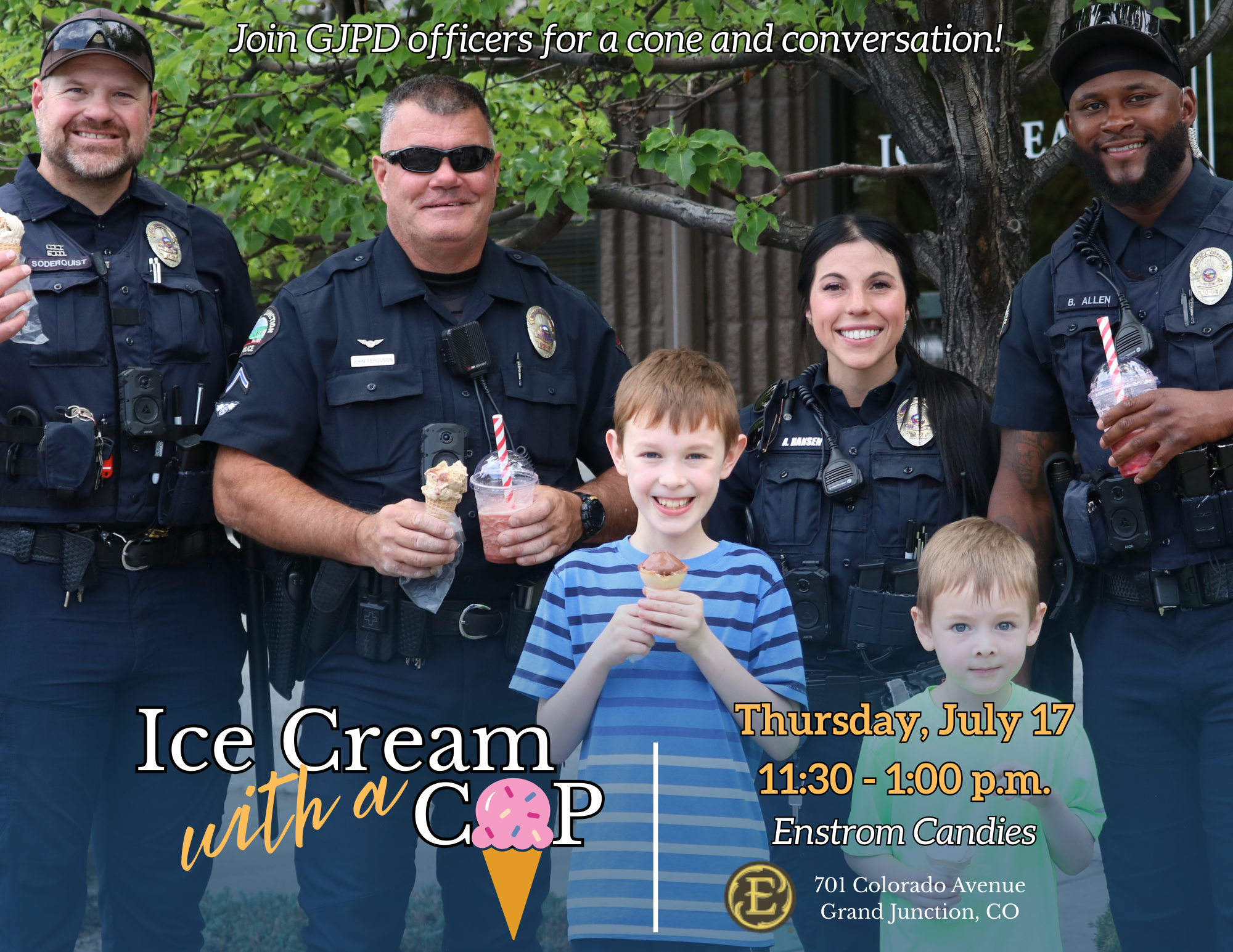 After the overwhelming success of June’s event, Ice Cream with a Cop is back! Join the Grand Junction Police Department at Enstrom Candies on Thursday, July 17, from 11:30 a.m. to 1:00 p.m., for another round of sweet treats and even sweeter conversations.