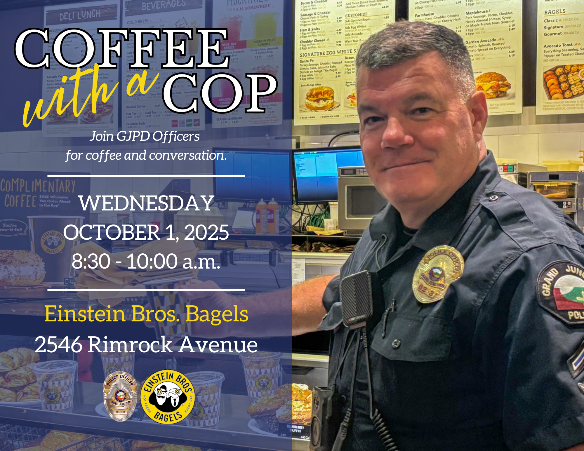 Grand Junction, CO - The Grand Junction Police Department invites the community to join officers for Coffee with a Cop on October 1, 2025, at Einstein Bros. Bagels located at 2546 Rimrock Avenue, from 8:30-10:00 a.m.